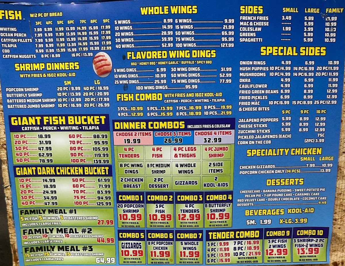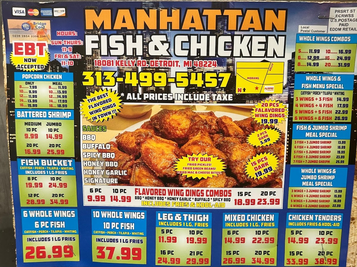 Introducing the menu at Manhattan Fish & Chicken - Detroit, a beloved local eatery located at 18081 Kelly Rd, Detroit, MI. This delightful spot showcases an array of mouthwatering dishes, where seafood lovers can indulge in options like Whiting, Ocean Perch, and Catfish Fillets, all at an affordable price of only $7.99. For those craving chicken, the menu features scrumptious items such as Leg & Thigh and Chicken Tenders.
